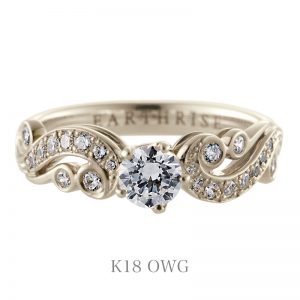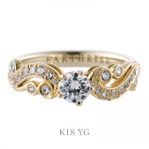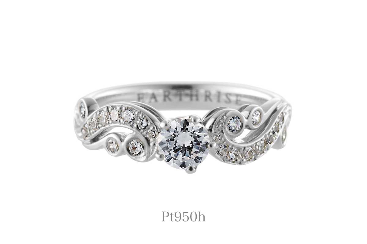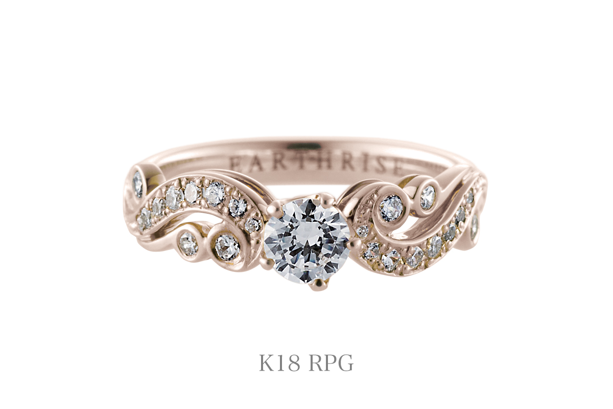 左右から伸びる唐草が〔愛の花〕を象徴するセンターのダイヤモンドをつつみ、花開く瞬間を表現しました。〔愛〕と〔繁栄〕の象徴とされる唐草模様。歳月と共に、ふたりの愛がより豊かなものとなりますように。