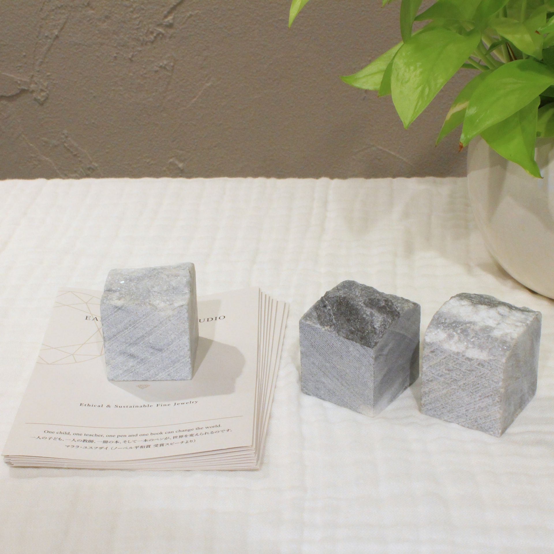 ご自宅でもエシカルなインテリア雑貨を作れないか何年も構想を練っていたところ、現地の職人のツテで貴重な大理石の鉱山と繋がり、今回キューブストーンを制作することが出来ました。